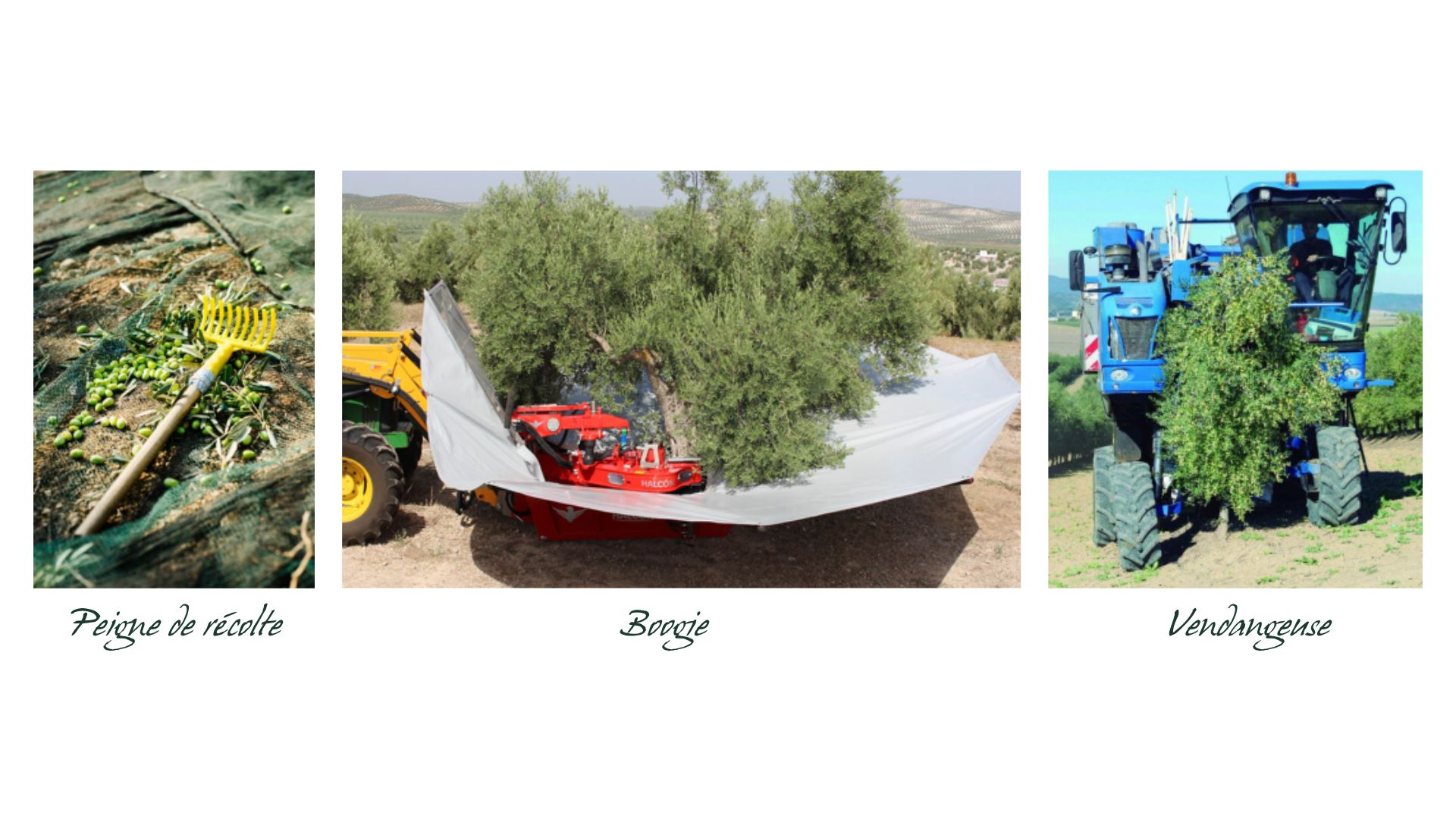 Le Boogie, aussi appelé vibreur de tronc, entoure l'arbre et le secoue pour en récupérer les olives. Cette technique est possible pour des oliveraies suffisamment grandes.